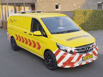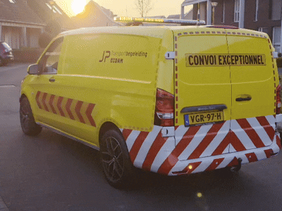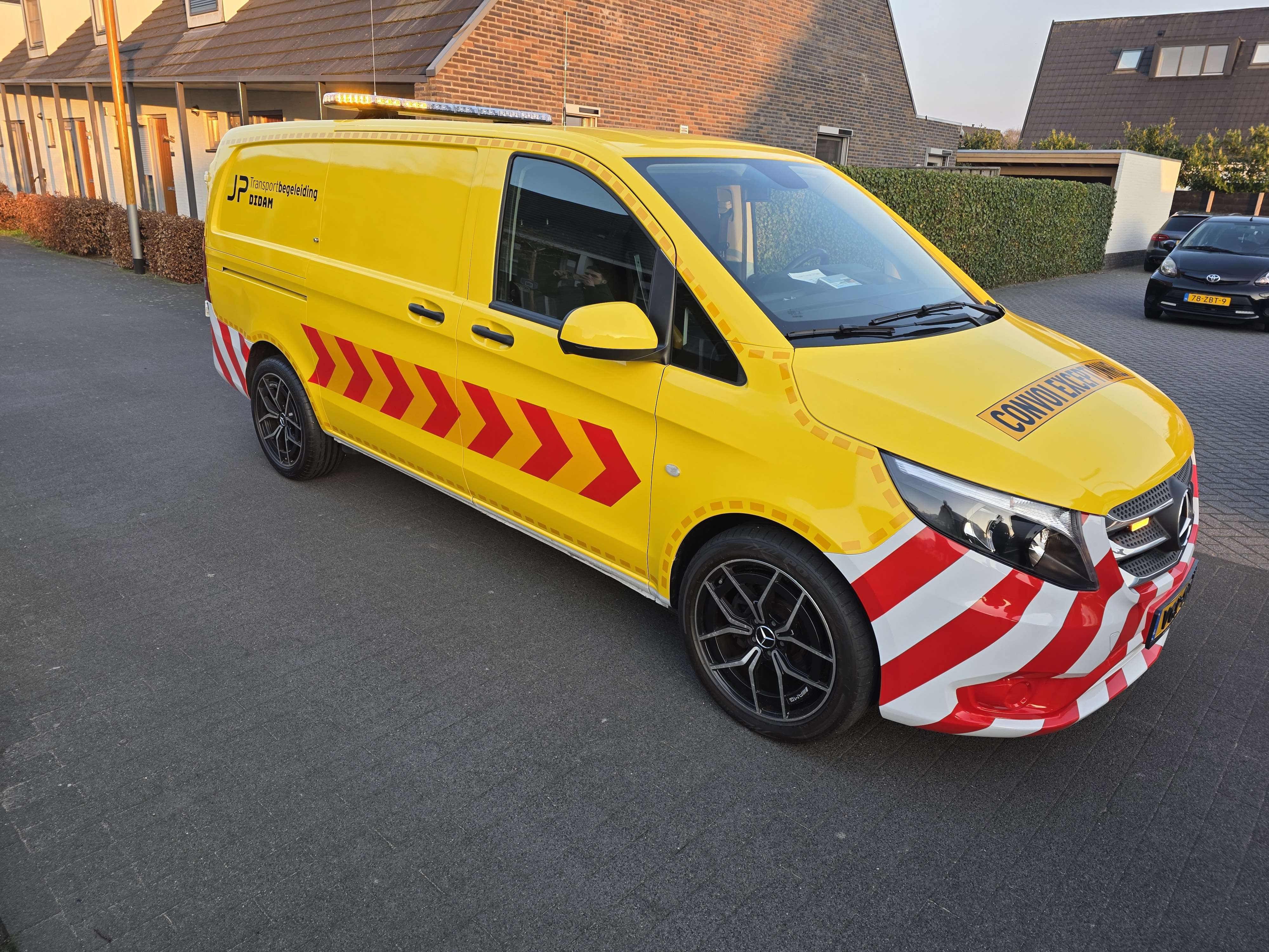 Begeleidingsvoertuig met zichtbare signalering, heldere communicatie en een nette, praktijkgerichte afwerking voor dagelijks inzetwerk.
